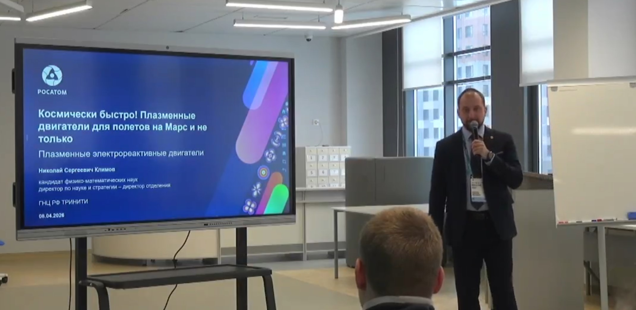 С особым интересом участники встречи слушали доклад директора по науке и стратегии – директора отделения Николая Климова о космических двигателях нового поколения. Он рассказал о современных научных исследованиях и технологических разработках, которые ведутся в научном институте «Росатома» в Троицке, в частности, о плазменных двигателях для полёта на Марс и не только, которые сегодня разрабатывают ученые.